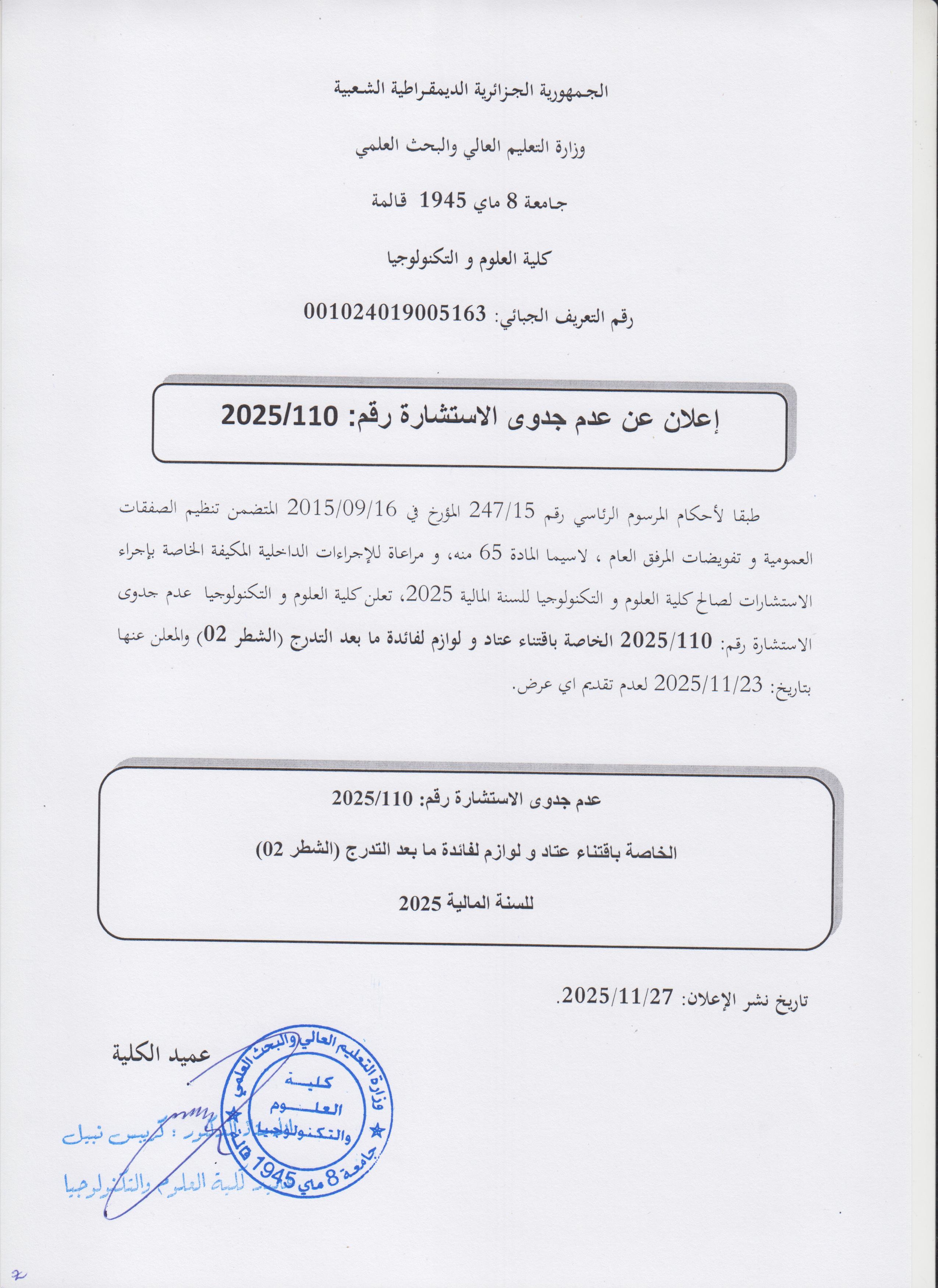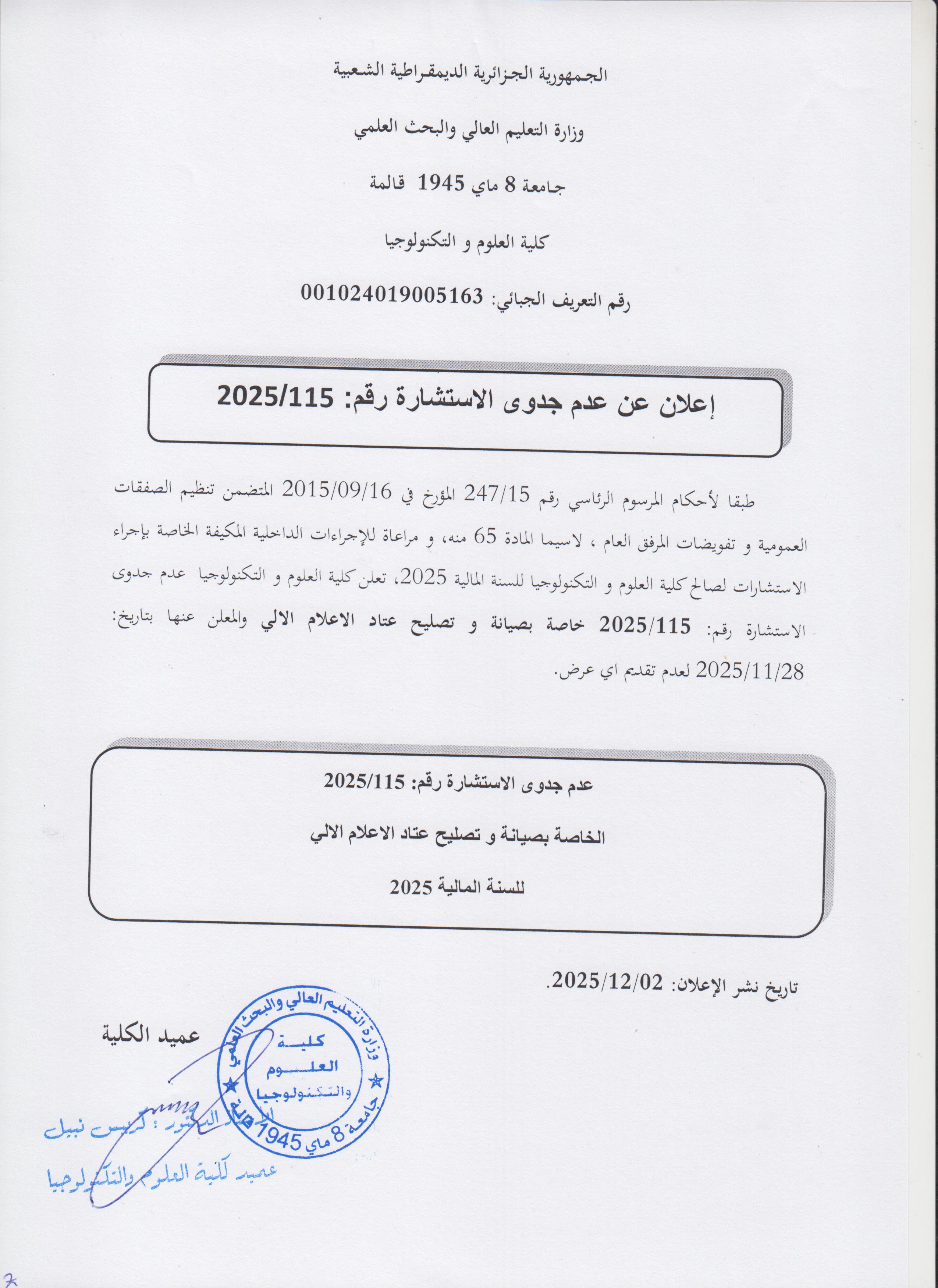 اعلان عن عدم جدوى للاستشارات 105/110/115/116/2025