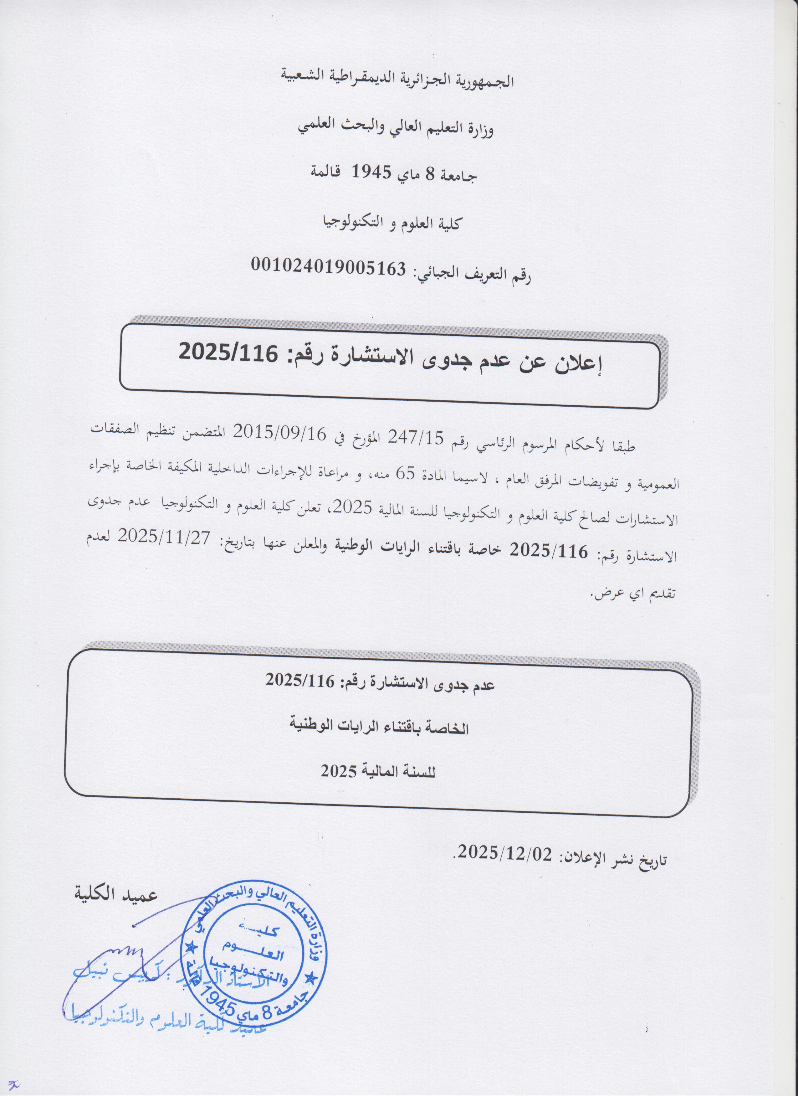 أربعاء, 12/03/2025 - 16:07اعلان عن عدم جدوى الاستشارة رقم 2025/116