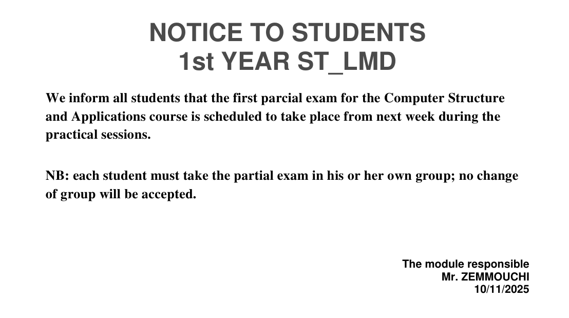 Notice to 1ST students (partial exam for the INFOTMATIQUE 2)