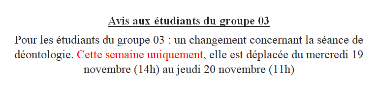 Changement d'heure pour la séance de déontologie (Groupe 03)