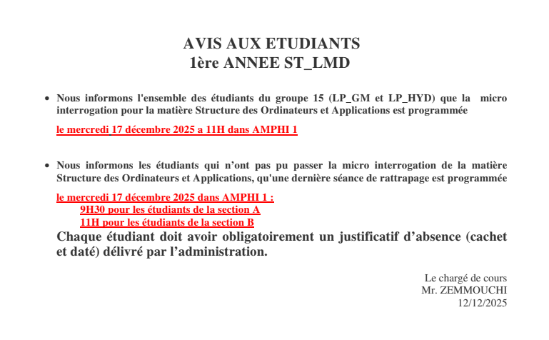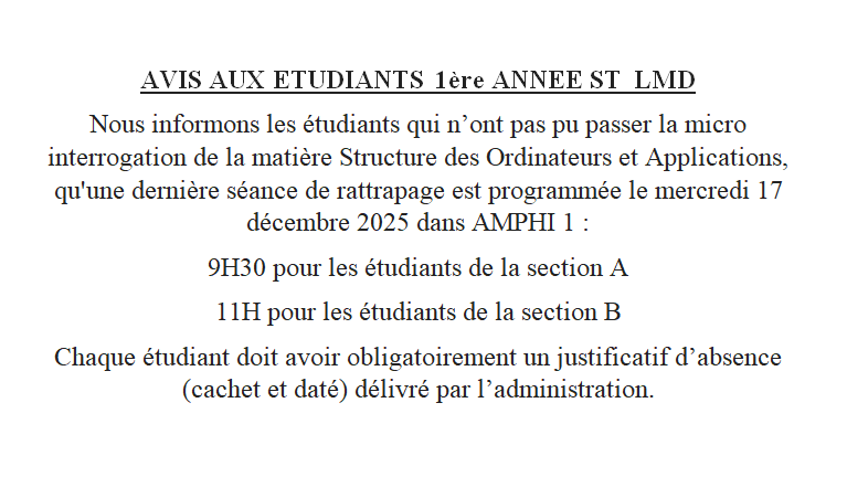 AVIS AUX ETUDIANTS 1ère ANNEE ST_LMD (séance de rattrapage micro interrogation Informatique 2)