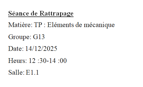 TP Element de mécanique (sous groupe 02 puis sous groupe 01 ) ----> labo de physique Bloc E1, 1er étage
