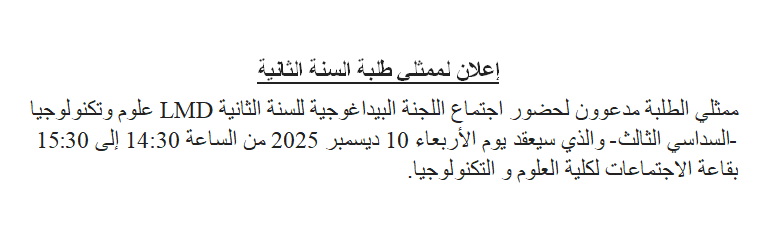 ليكن في علم ممثلي الافواج (délégué) أنهم مدعوون لحضور اجتماع اللجنة البيداغوجية للسنة الثانية يوم الثلاثاء 2023/11/14 على الساعة الواحدة 13سا بقاعة الاجتماعات للكلية (القاعة مقابلة للمدرج رقم 03)