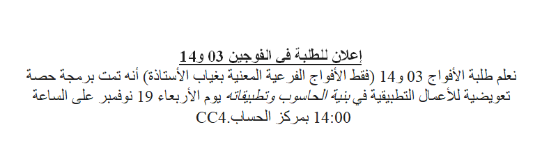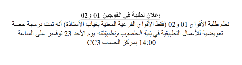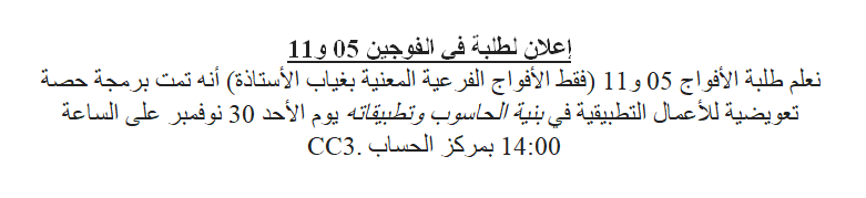 إعلان إلى طلبة الفوج 06 (برمجة حصة استدراكية في مقياس الإعلام الآلي 2)