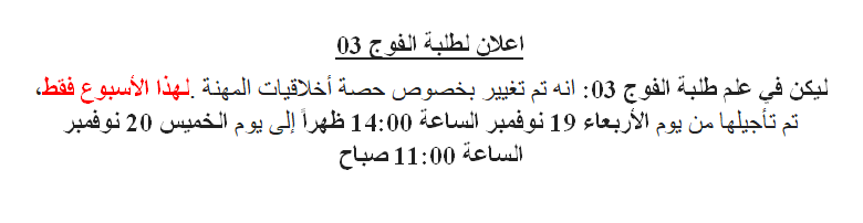ليكـن فـي عـلــم طـلـبـة الافواج 03 مجموعة فرعية (أ) و فوج 18 مجموعة فرعية (أ+ب) انه ستكون هناك حصص اضافية كالاتي :