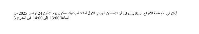 ليكن في علم طلبة السنة أولى ليسانس علوم و تكنولوجيا انه برمجت حصة تعويضية لمادة : الحبر سنة أولى ليسانس علوم و تكنولوجيا يوم الأربعاء 2025/10/08 على الساعة : 12:30 - 14:00 المدرج رقم 1