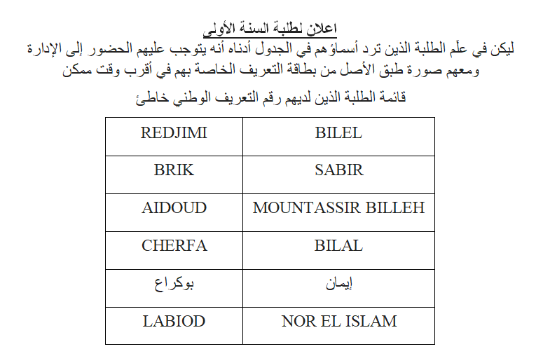 نطلب من الطلبة الآتية أسماءهم التقرب من نيابة العمادة في أقرب الآجال مصحوبين ببطاقة الطالب لأجل الـتأكد أو تصحيح رقم ال RFID :