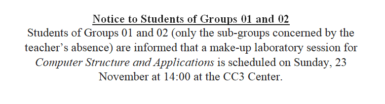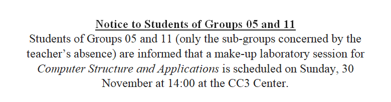 Computer Structure Lab (subgroup 01 then subgroup 02) ----> CC COMPUTING CENTER - Block E6, floor 2