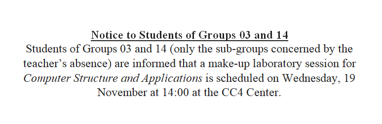 Students in groups 01 and 09 are informed that this week it is the turn of subgroup A for computer classes.