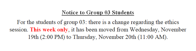 Let all students know that they are required to be present on Thursday to study the Professional Ethics Standard as scheduled, Section “B” from 12:30 p.m. to 2:00 p.m. and Section “A” from 2:00 p.m. to 3:30 p.m.