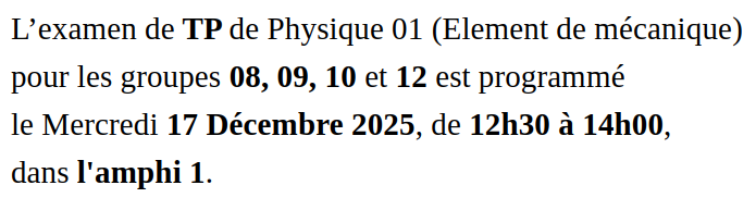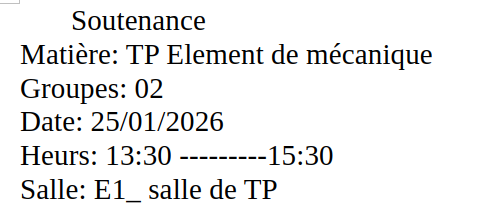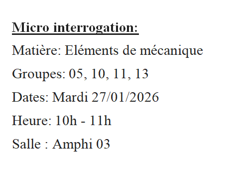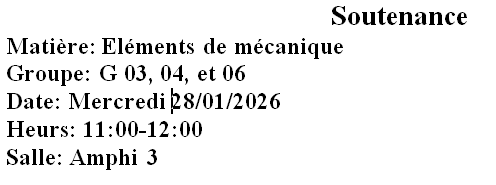 TP Element de mécanique (sous groupe 02 puis sous groupe 01 ) ----> labo de physique Bloc E1, 1er étage