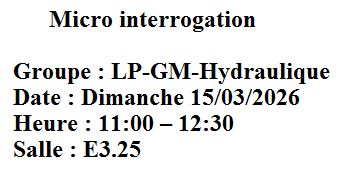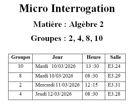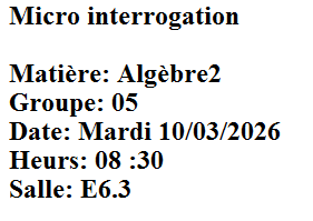 Remarque: les séances des micro interrogations et des soutences des TP seront programmées au cours cette semaine, svp vérifiez l'affichage