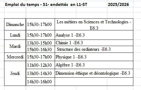 Emploi du temps des étudiants Endettés en 1ST Licence