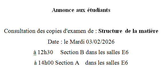 TP structure de la matière ( un seul sous groupe uniquement ) -------> L8.3, L8.5, L6.5,... les labos de Département génie de procédés en face de l'amphi 1