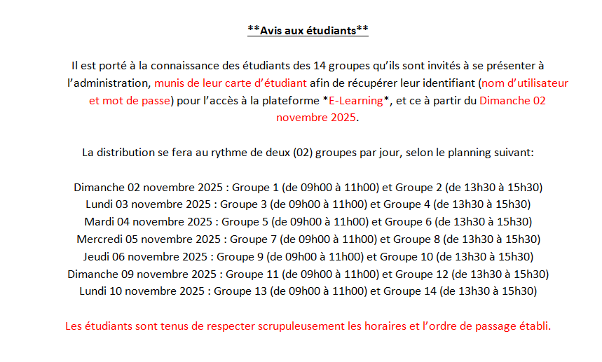 Faites savoir aux étudiants que la reprise des études pour le deuxième semestre débutera le dimanche 04/11/2021