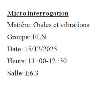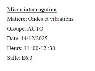 Nous informons les étudiants 2eme ST qu’une micro interrogation ondes et vibration est programme le mardi 23/03/2021 de 10h00 a 11h00.