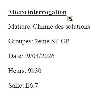 Nous informons les étudiants 2eme ST les groupes GP1/GP2qu’un Micro interrogation chimie des solutions est programmé le Mardi 08/06/2021 a10h00 E6.7
