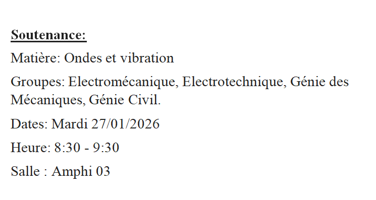 Soutenance: Ondes et vibration, Groupes: Electromécanique , Electrotechnique, Génie des Mécaniques, Génie Civil.