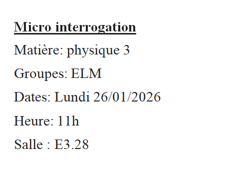 Nous informons les étudiants 2eme ST qu’une micro interrogation  ondes et vibration est programme le mardi 23/03/2021 de 10h00 a 11h00.