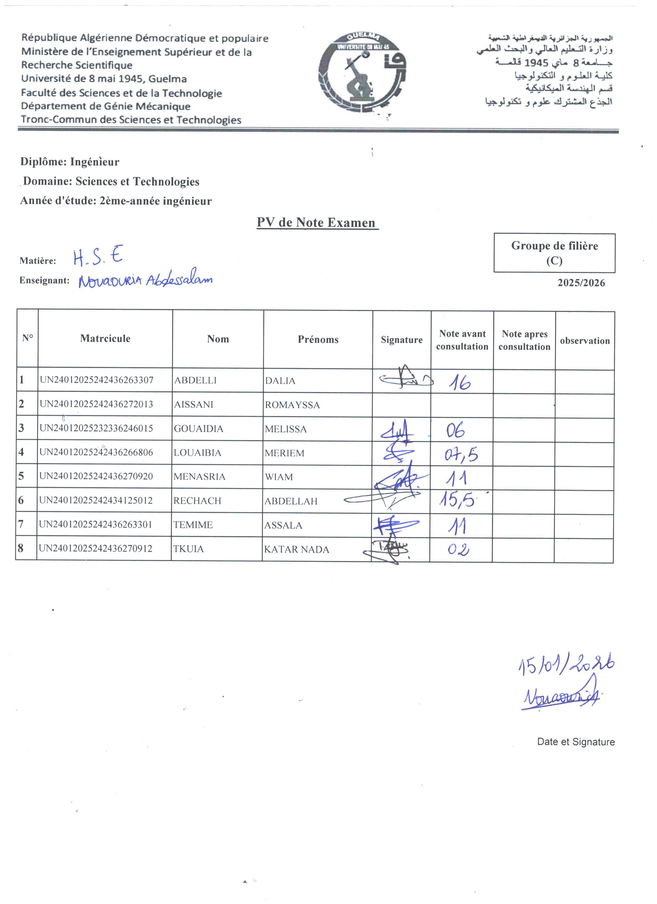 Consultation des copies d'examen H S E pour GP Ingénieur le Dimanche 18 janvier à: 11H00 Salle: E6.?