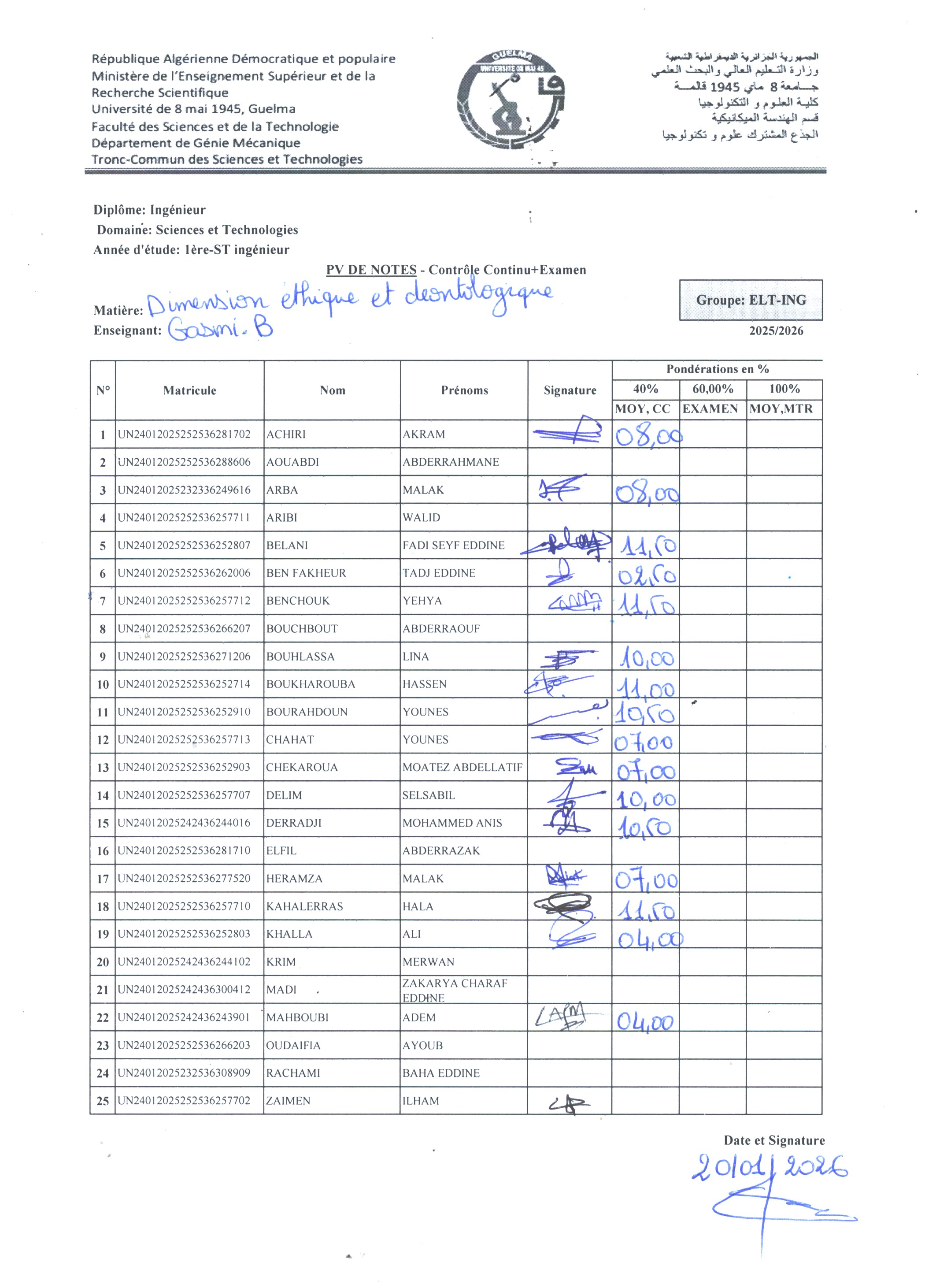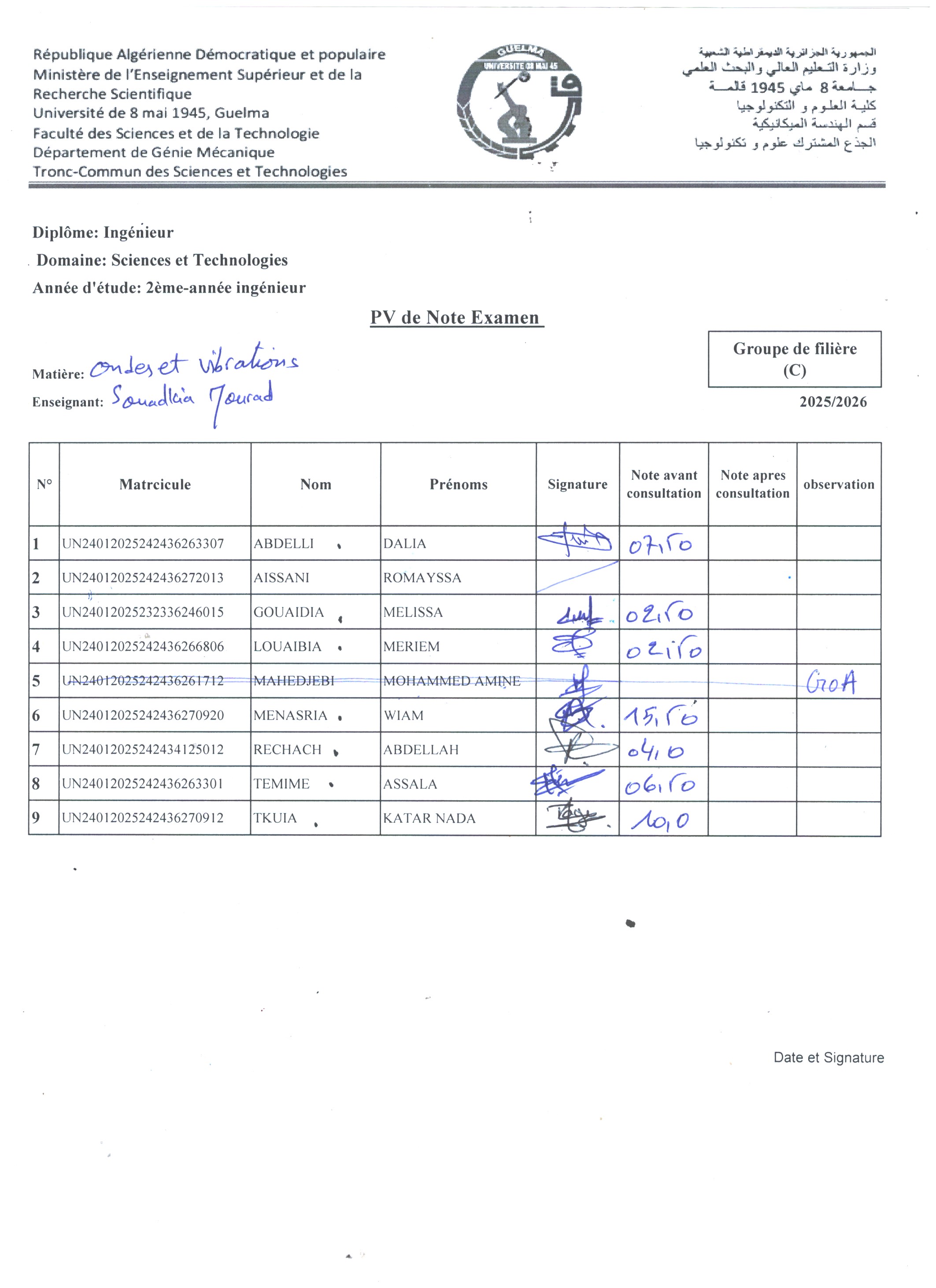 Il est porté à la connaissance des étudiants de 1ère année ingénieur (ST, GC, GM, ELT et GP) que la micro-interrogation collective de « Structure de la matière » est programmée pour le jeudi 27/11/2025 à 12h30, selon la répartition suivante: