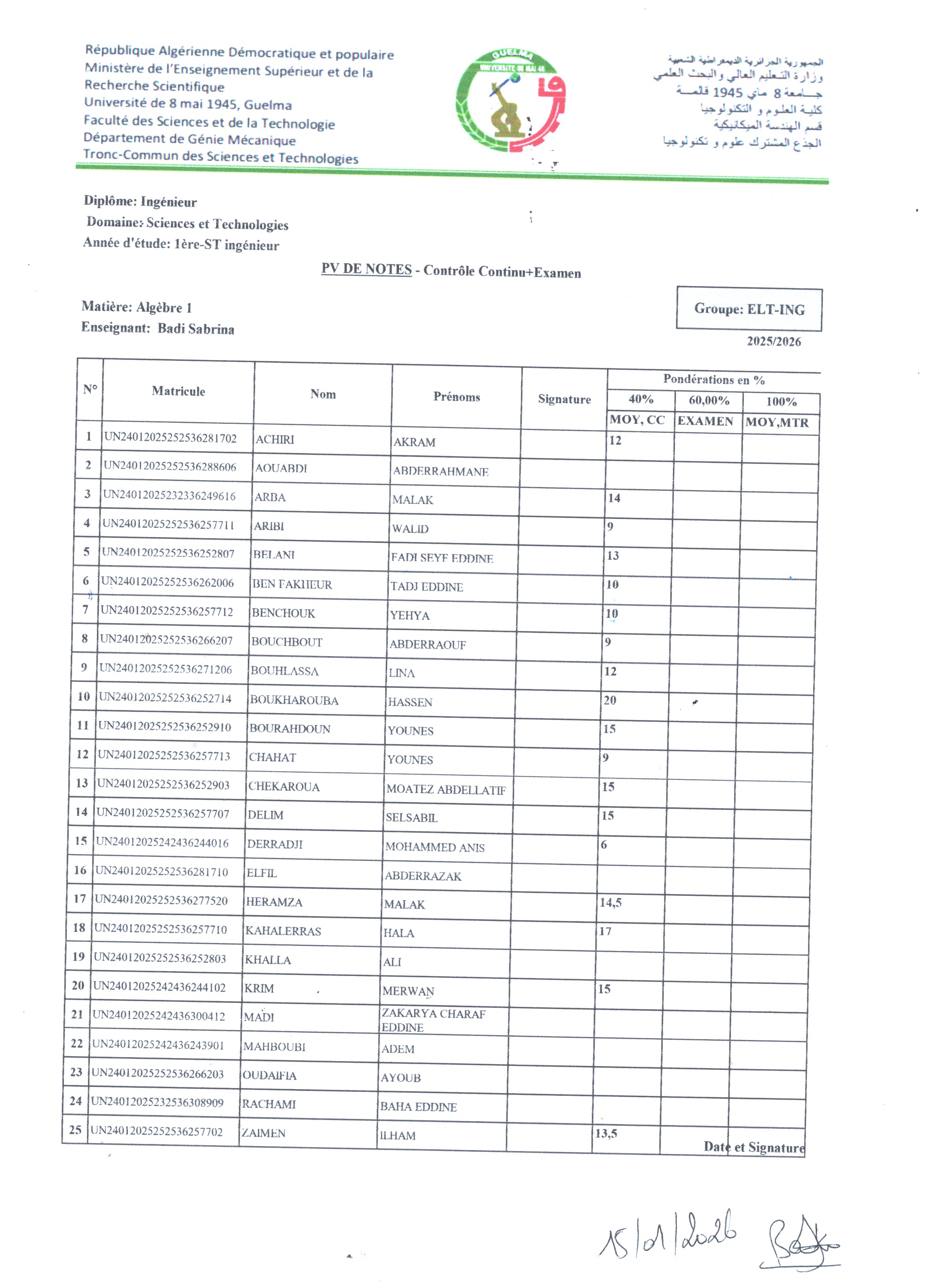 ليكن في علم طلاب السنة الأولى مهندس جميع التخصصات ان امتحان قصير المدى في مقياس تحليل 1 قرر يوم الاثنين الاول من ديسمبر 2025 ، الساعة 12:30 ظهرًا، وفقًا للجدول التالي: